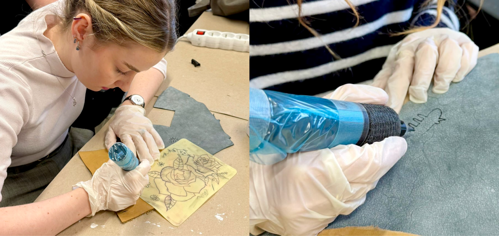 Součástí posledního setkání byla i netradiční zkušenost: studenti si mohli vyzkoušet práci s tetovacím strojkem, který pan Hladík, mimo jiné také velmi úspěšný tatér s více než 230 tisíci sledujícími na Instagramu, přinesl na jejich žádost. Studenti tetovali na pravou useň, tedy materiál, se kterým v ateliéru běžně pracují při výrobě obuvi a módních doplňků. Zároveň zjistili, že klasické barvy určené pro lidskou pokožku nejsou pro useň ideální, takže výsledný efekt nebyl zcela podle očekávání. Do budoucna však plánujeme hledat řešení, jak tetování na useň posunout dál a využít ho jako zajímavou formu povrchové úpravy designových produktů.